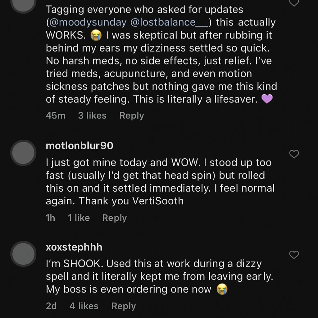 Reported immediate calming effects during sudden dizziness episodes with a single swipe.